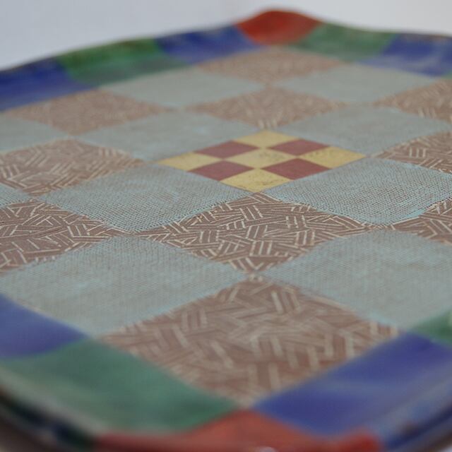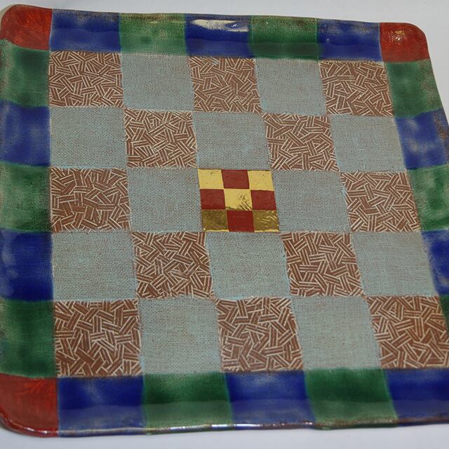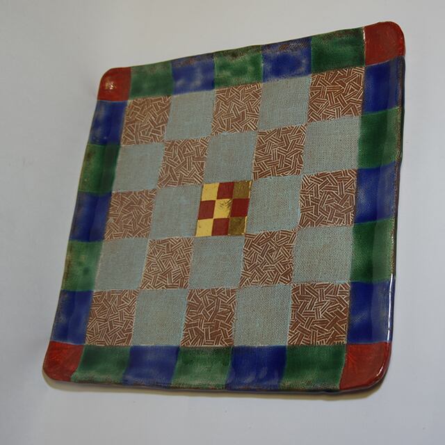 自動車デザイナーとして著名な黒木正博氏がタイで製造し、国内に逆輸入した花絵の正角皿。布目を市松状に配した美しい美品