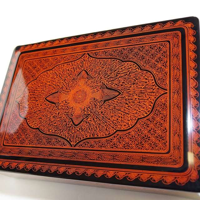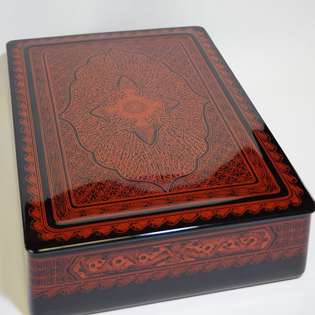 坂本雪斎氏の作風である細やかな紋様がところ狭しと施された贅沢な文箱。光沢も紋様も全て美しい美品